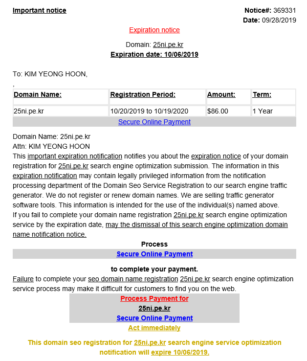 도메인 만료 안내 메일이 와서 확인해보았더니... 영어로 된 메일..